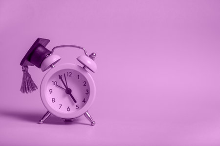 Yellow alarm clock with graduation cap on violet background close up with copy space