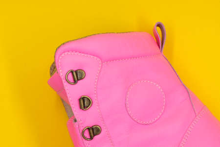 Women's pink shoe on a yellow background. Fashion concept