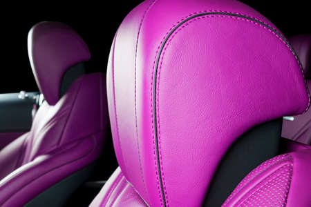 Modern Luxury car inside. Interior of prestige modern car. Comfortable leather red seats. Pink perforated leather. Modern car interior details