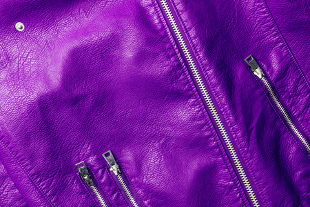 top view of violet leather shiny textile with zippers as background