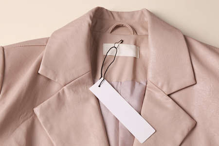 Blank white tag on beige leather jacket, top view. Space for text