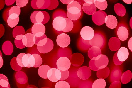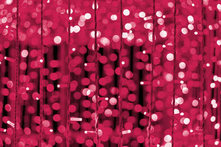 Festive Christmas backdrop with xmas lights bulb and bokeh. Full-frame textured backdrop. Toned in color of year 2023 Viva Magenta