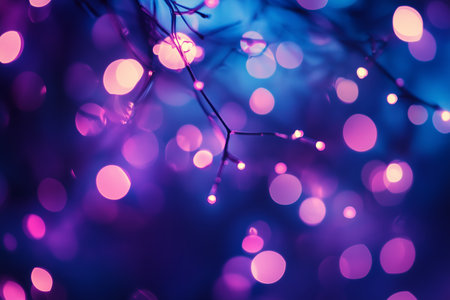 Defocused bokeh lights on black background, an abstract naturally blurred backdrop for Valentines Day or birthday party. Festive light texture. Violet blue garland in blur. Color 2022