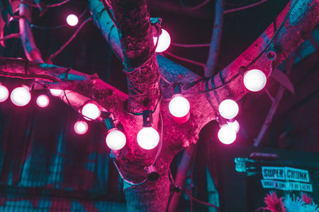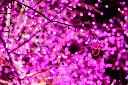 New Year or Christmas city illumination cherry or sakura tree. Street decoration. Banner with the holiday mood. Beautiful garden lights. Abstraction art background.