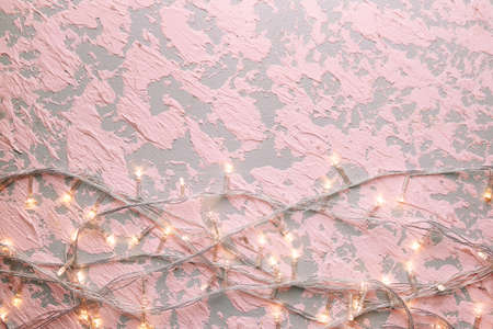 Christmas lights with golden stars glowing on soft light pastel pink background, border, copy space, top view.