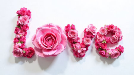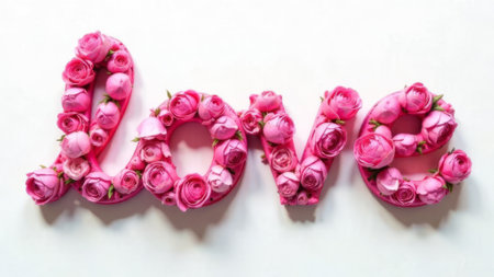 Word LOVE made of pink roses on white background. Valentines day flat lay with floral lettering. Nature love concept for February 14. Top view of romantic lettering made of flowers.
