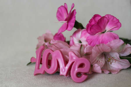 A stunning floral display featuring an array of colorful flowers against a soft pink background, highlighting the word Love. Perfect for romantic themes.