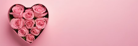 Header with bouquet of rose flowers on a pink background. Present for Mothers Day. Festive concept with place for text.