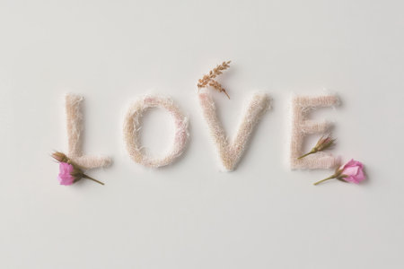 The arrangement features the word LOVE made from soft fabric, adorned with pink flowers and wild grass, all set against a serene white backdrop.