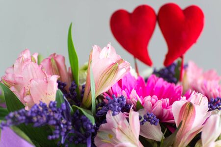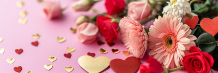 Close up of a bouquet of pink roses on pink and red hearts background. Valentine's Day decoration