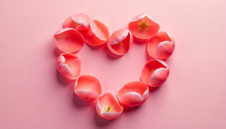A stunning arrangement of soft pink roses lies gracefully on a pink surface, surrounded by shimmering heart confetti and dreamy bokeh lights, perfect for romantic themes.