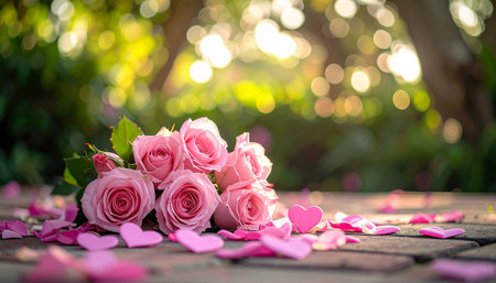 A bouquet of pink roses lies on a brick path with scattered rose petals and heart shapes.