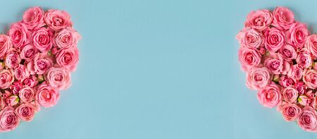 Valentine's day greeting card background. Romantic composition with a heart of pink roses on a blue background.Mothers day.Banner for advertising the store, website, posters, Copy spase. Wreath.Frame.