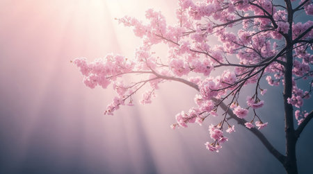 Beautiful cherry blossom tree branches with delicate pink flowers blooming under soft sunlight, creating a serene and dreamy atmosphere. Ai generated image