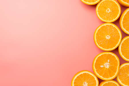Top view photo of cut oranges on the right on isolated pastel pink background with copyspace on the left