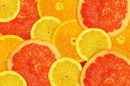 Slices of oranges and a grapefruits as a background.