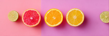 Bright banner with slices of citrus lemon, lime, orange and grapefruit on a yellow-pink background with space for text. Advertising.