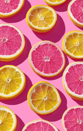 Bright slices of pink grapefruit and yellow lemon are artistically arranged on a vibrant pink background, creating a cheerful and refreshing visual display perfect for summer.