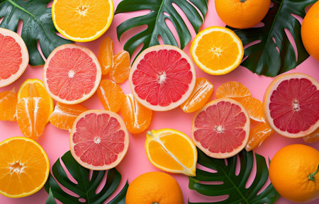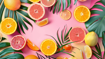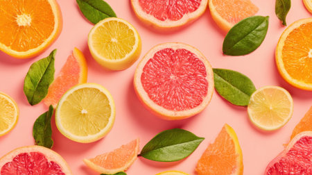 Slices of orange, grapefruit, and lemon lay scattered on a pink surface, surrounded by fresh green leaves, creating a bright and cheerful arrangement perfect for summer.