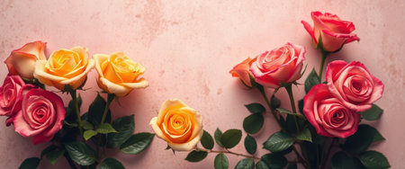 A close-up view of yellow and pink roses with green leaves arranged on a pale pink background.