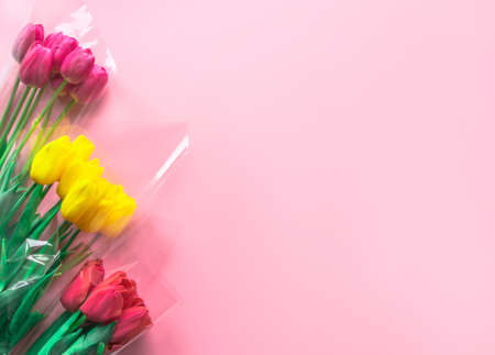 Fresh bouquets of tulips flowers on delicate pastel light pink paper background. Greeting card for Valentine's Day, Mother's or Woman's Day. Beautiful spring concept. Flat lay, top view, copy space.