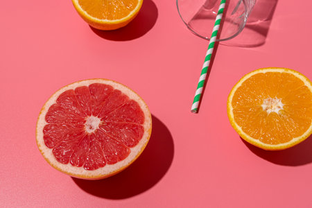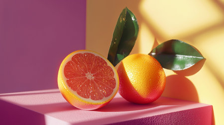A vibrant composition of fresh grapefruit and orange casting shadows on a bright pink and yellow background, representing freshness, health, and vibrant energy.