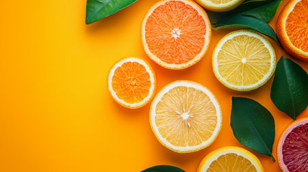 A colorful citrus fruit wheel displays fresh sections of orange and yellow varieties, arranged aesthetically on a bright backdrop, leaving space for content.