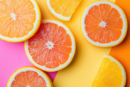 Orange and grapefruit slices on colorful background. Flat lay, top view