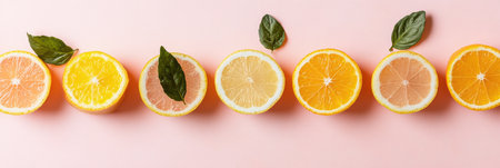 Slices of oranges and lemons beautifully arranged in a row, showcasing vibrant colors and freshness,.