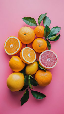 A vibrant assortment of citrus fruits including oranges, lemons, and grapefruit is beautifully arranged against a pink background, highlighting their freshness and color.