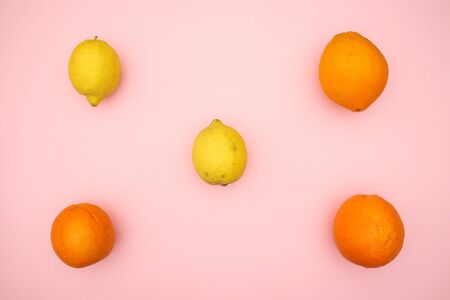 Oranges and lemons on pink background