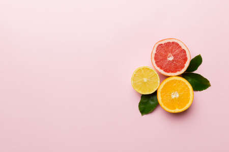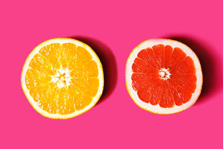 Fresh orange and grapefruit slices on pink background