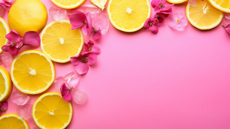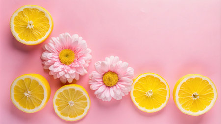 Pink flowers and lemon slices on a pink background.