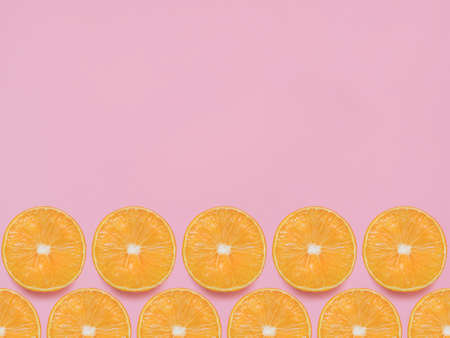 oranges. Top view photo with copy space. Halved fresh citrus fruits in rows on pink backdrop