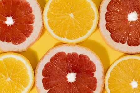 Pattern of citrus orange and grapefruit slices on light yellow background. Top view. Minimal design.