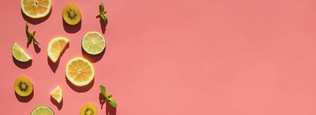 Summer banner with sliced fruits and mint in natural sunlight on pink background with copy space