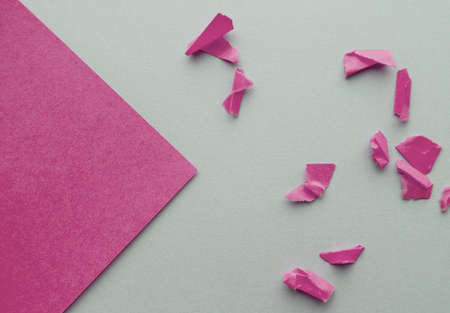 Corner dark pink paper with a copy of the space on a gray background and small torn and crumpled pieces of paper, a template for your design