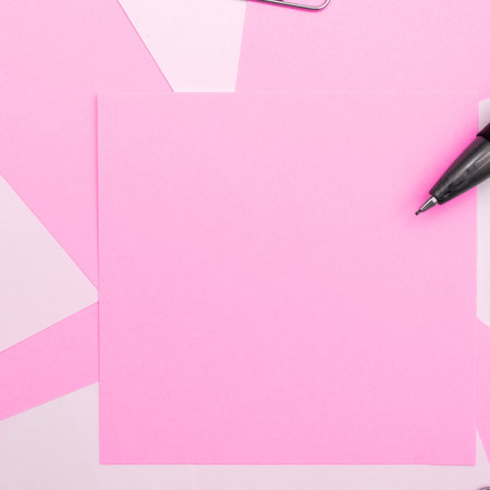 The concept is pink. Blank square small sheets of paper and a pen on a pink background. Top view