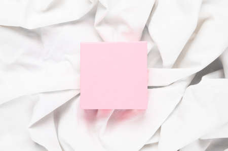 Top view of pastel pink podium on white wavy fabric background. High quality photo