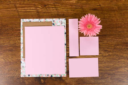 Top view of a variety of elegant stationery and sheet of pink paper in various sizes and a flower, arranged on a textured wooden surface.