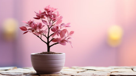 Pink girlish glamour bonsai tree in a dark pot on blurred background. Generative AI.