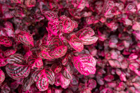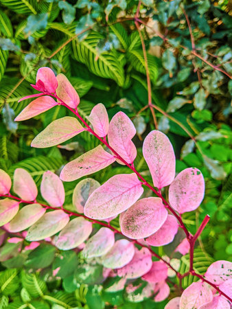 Bright pink leaves create an eye-catching display, showing their smooth textures and elegant shapes among the greenery, highlighting the beauty of nature in a vibrant garden environment.