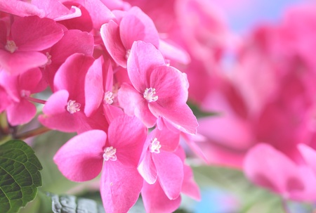 Beautiful carpet of pink blooming flowers. Texture for wallpaper or web banner. Blossoming hydrangea close up.