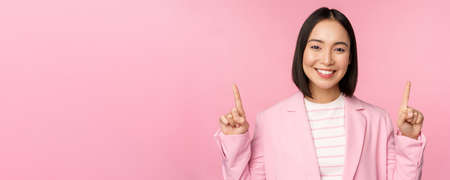 Portrait of asian businesswoman pointing fingers up and smiling, showing business company logo, information on top, standing over pink background