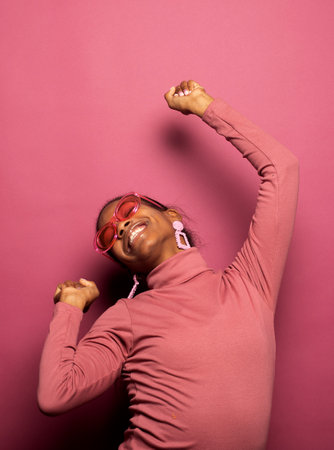 Portrait of overjoyed black female clenches fists with happiness, opens mouth widely as shouts loudly, celebrates her success, poses against pink background. Happy African woman with joyful expression