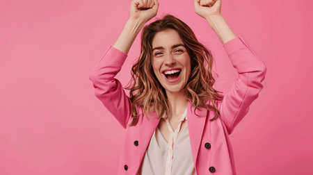 A joyful young woman celebrates her success with a radiant smile against a vibrant pink background. Her cheerful expression radiates excitement and positive energy.