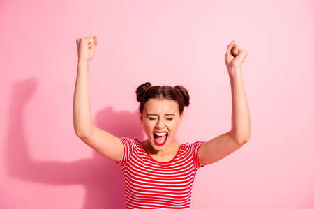 Close-up portrait of her she nice-looking cute charming attractive glamorous lovely cheerful girl wearing striped t-shirt raising hands up celebratory isolated over pink pastel background
