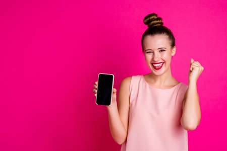 Portrait of gorgeous teen teenager hold hand show device gadget achieve aim fortune lucky she person raise her fist scream yeah isolated bright background pink wear youth clothing top-knot