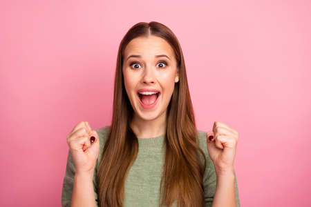 Portrait of lovely astonished candid girl impressed by dream present she get on holiday fall celebration shout yell wear sweater isolated over pastel color background