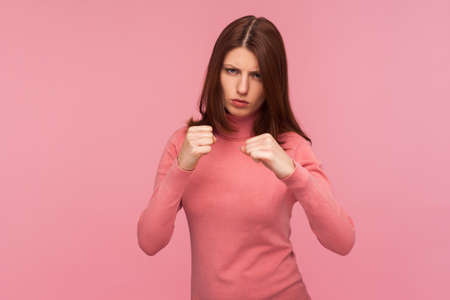 Serious self confident woman with brown hair holding clenched fists up ready to make blow, attack, self defence courses. Indoor studio shot isolated on pink background